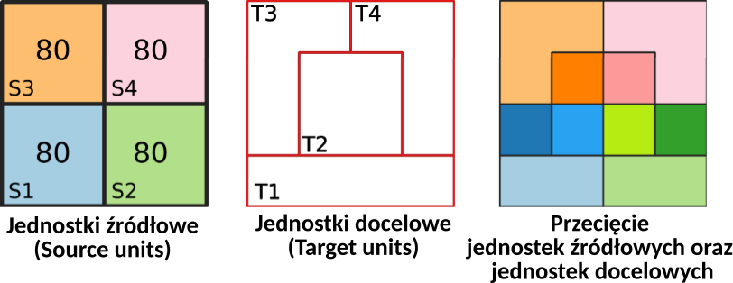 - \(W_i\) - waga “powierzchniowa” przypisana do każdego poligonu \(i\) powstałego z przecięcia granic źródłowych oraz docelowych;