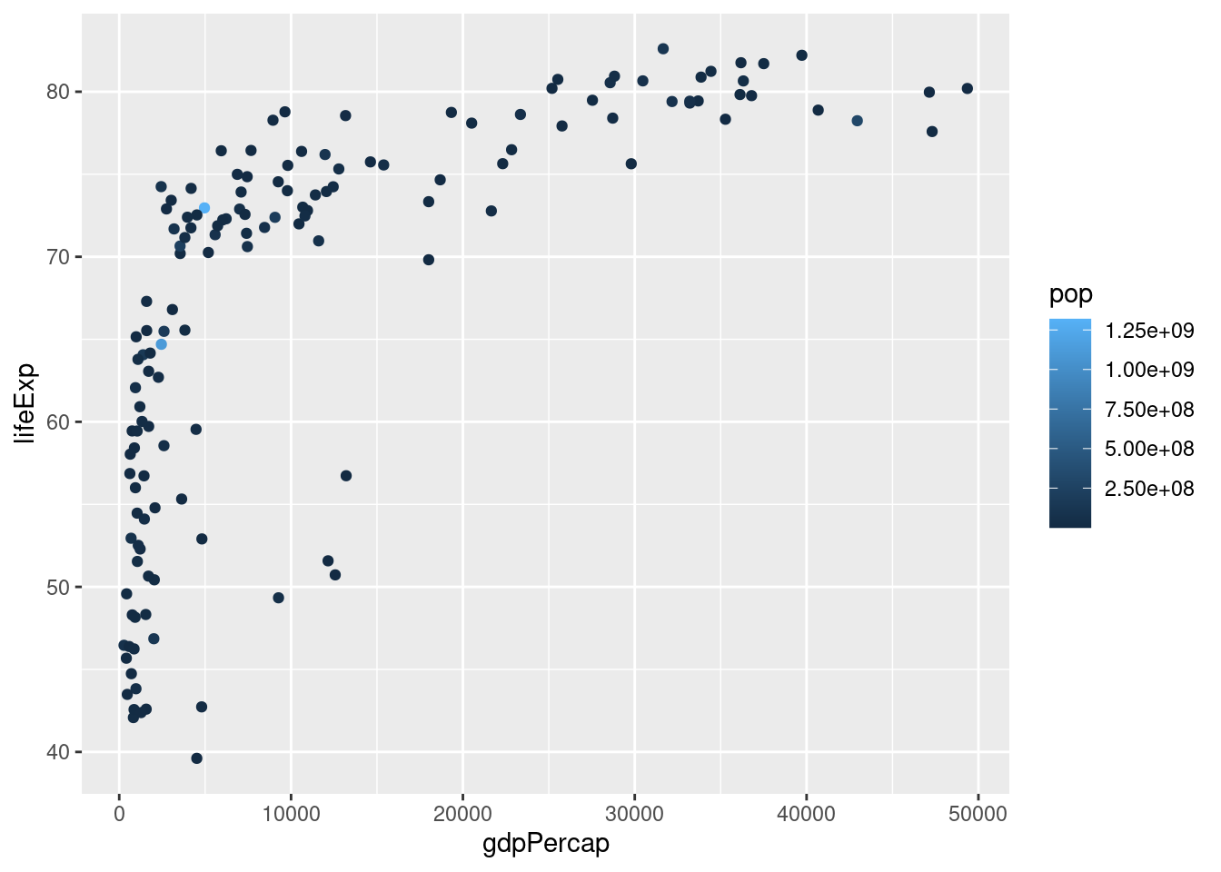 ggplot(data =dane2007, aes(x = gdpPercap, y = lifeExp, color = pop)) +
