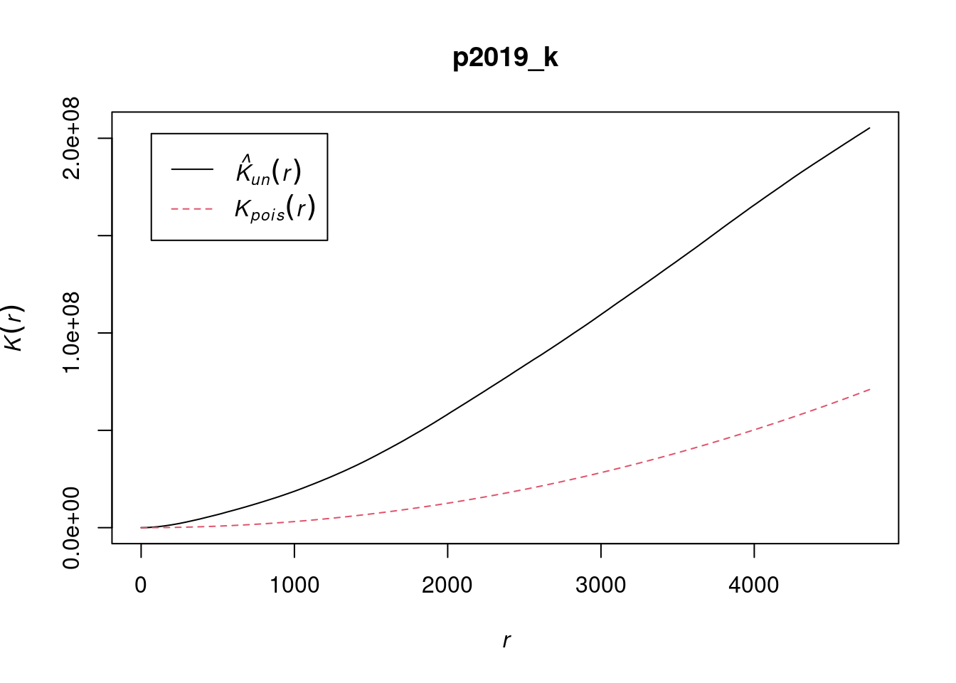 W poniższym przykładzie funkcja empiryczna (\(\hat{K}_{un}\)) przyjmuje wyższe wartości niż funkcja teoretyczna (czarna linia znajduje się powyżej czerwonej) - wskazuje to, że punkty zlokalizowane są bliżej siebie niż to wynika z rozkładu losowego (może wskazywać na istnienie klastrów w danych).