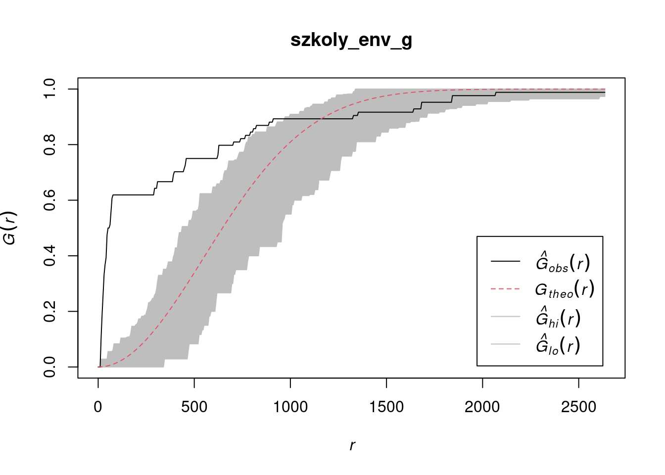 W przykładzie funkcja empiryczna (\(\hat{G}_{raw}\)) przyjmuje wyższe wartości niż funkcja teoretyczna (czarna linia znajduje się powyżej czerwonej) - wskazuje to, że punkty zlokalizowane są bliżej siebie niż to wynika z rozkładu losowego (może wskazywać na istnienie klastrów w danych).