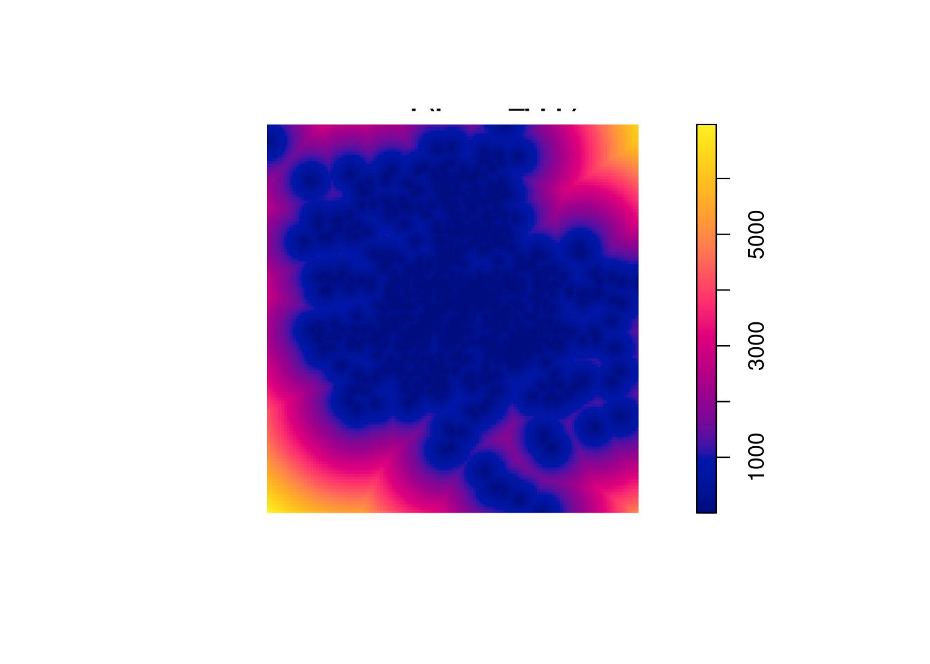 distmap()- oblicza odległość od każdej komórki do najbliższego punktu i zwraca mapę rastrową.
