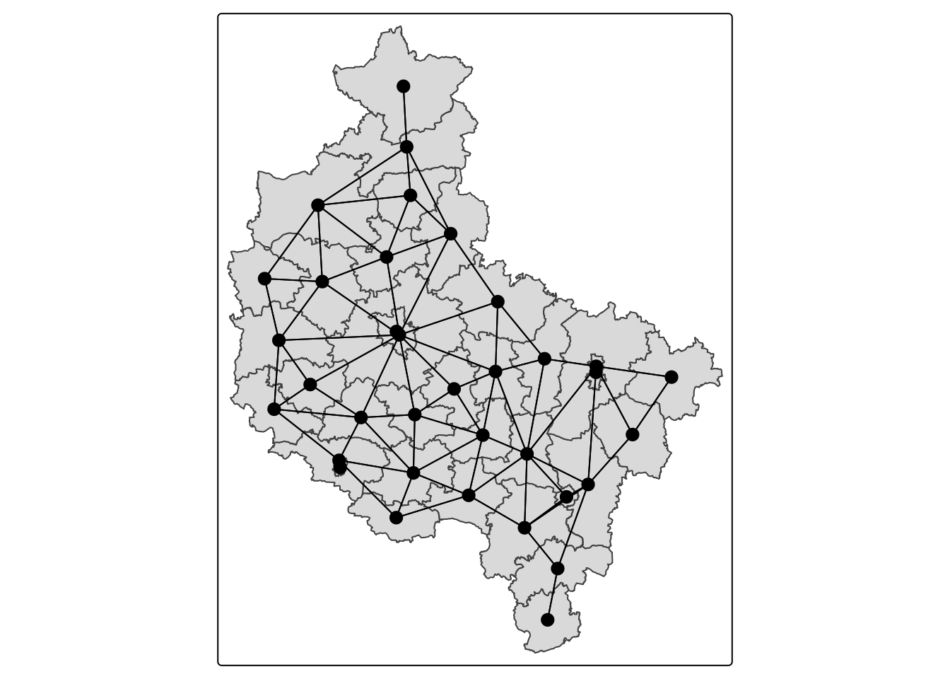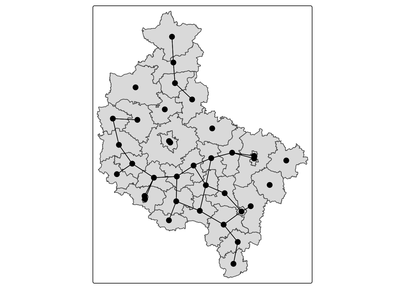 tm_shape(powiaty_nb_d_net) + tm_lines() + tm_shape(powiaty_cen) + tm_dots(size =0.6 , col = "black")