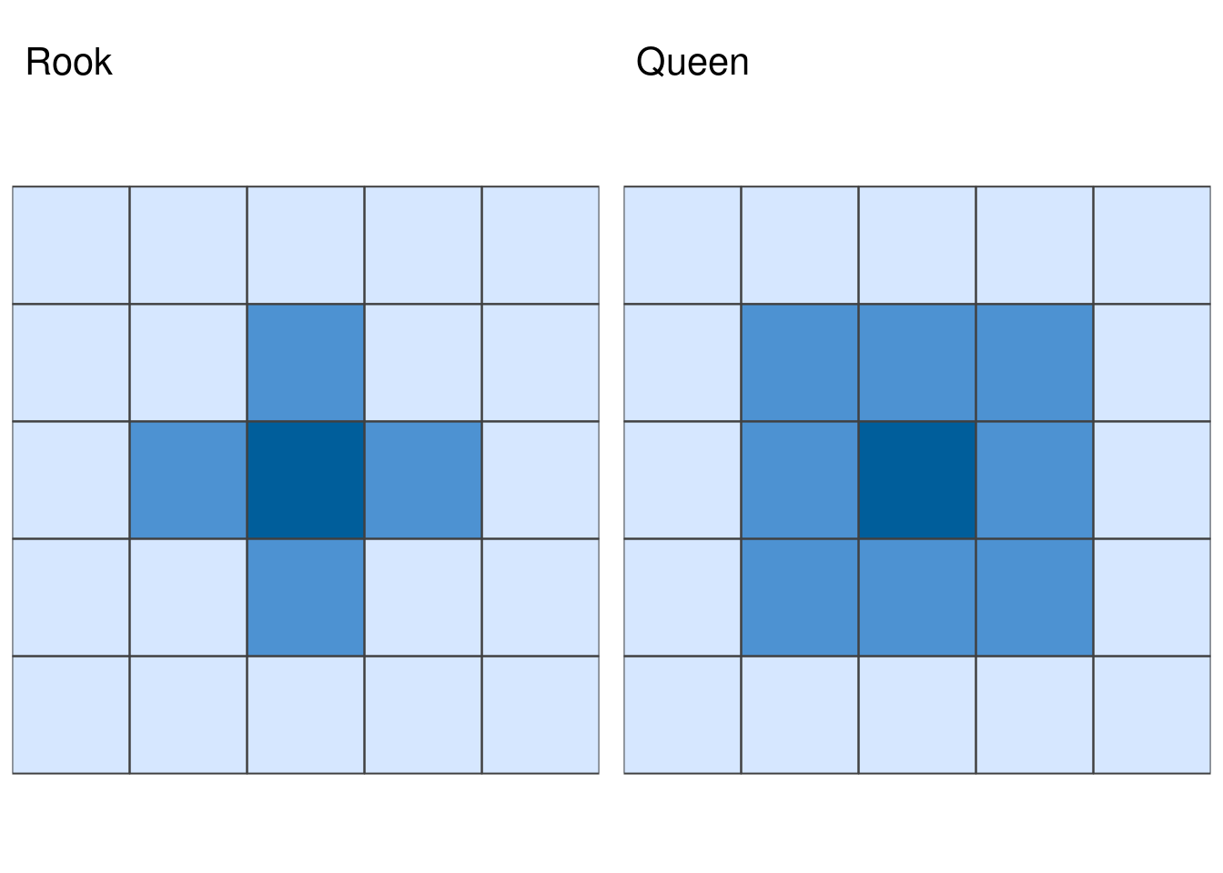 Kryterium wspólnej granicy obszarów (adjacency) zakłada, że sąsiedzi to obszary, które mają wspólną granincę. Wspólną granicę obszarów można wyznaczyć posługując się regułą Rook lub Queen