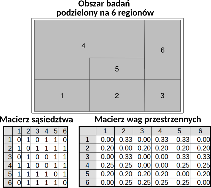 Mając definicję sąsiedztwa przestrzennego, możemy skonstruować macierz sąsiedztwa przestrzennego - tabelę, w której przechowywane są informacje o występowaniu (lub nie) relacji między obszarami (czy obszary ze sobą sąsiadują?). Najprostszą formą macierzy sąsiedztwa jest macierz binarna.