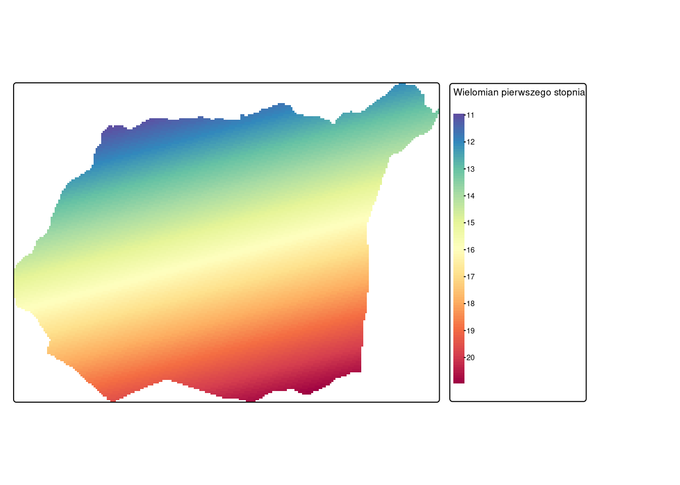 wielomian_1 <- gstat(formula = temp ~ 1, data = sp_punkty, degree = 1)Następnie funkcja predict() przenosi nowe wartości na wcześniej stworzoną siatkę.