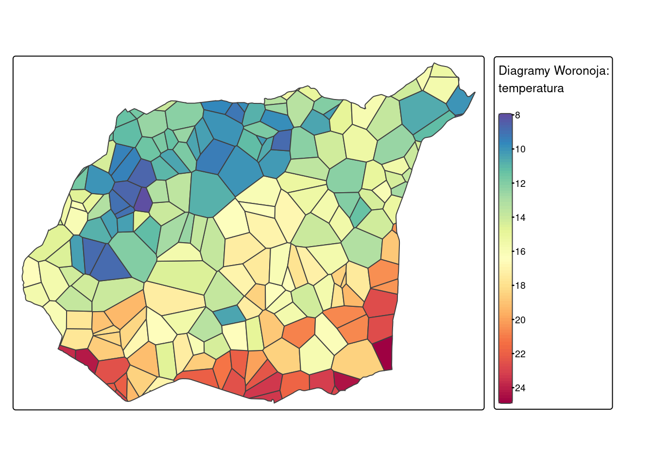 W poniższym przykładzie metoda poligonów Woronoja została zastosowana z użyciem funkcji voronoi() z pakietu terra.