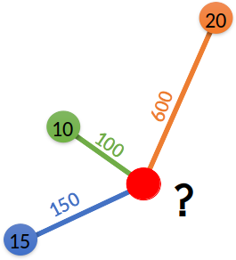 Oszacujemy wartość zmiennej (w czerwonym punkcie) na podstawie wartości oraz odległości przedstawionych na poniższym rysunku.