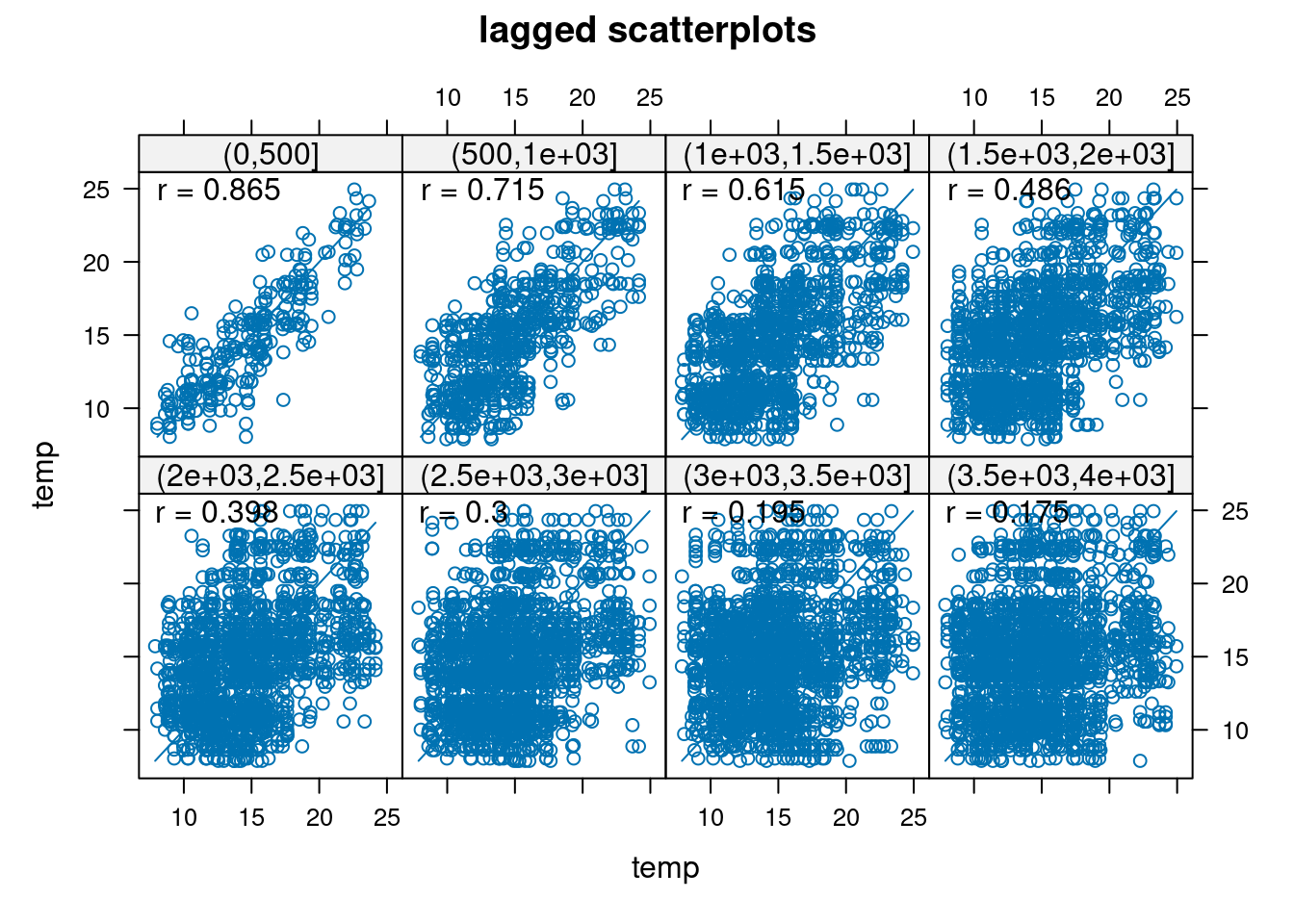 W klasycznej statystyce relację między dwoma zmiennymi określa się za pomocą korelacji (np. współczynnik korelacji liniowej Pearsona). W geostatystyce badamy jedną zmienną, ale pomiędzy dwoma punktami odległymi od siebie o pewien dystans (określany jako lag, h). Wykorzystuje się w tym celu wykres rozrzutu z przesunięciem. Wykres rozrzutu z przesunięciem pokazuje korelację pomiędzy wartościami analizowanej cechy w pewnych grupach odległości. Taki wykres można stworzyć używając funkcji hscat() z pakietu gstat