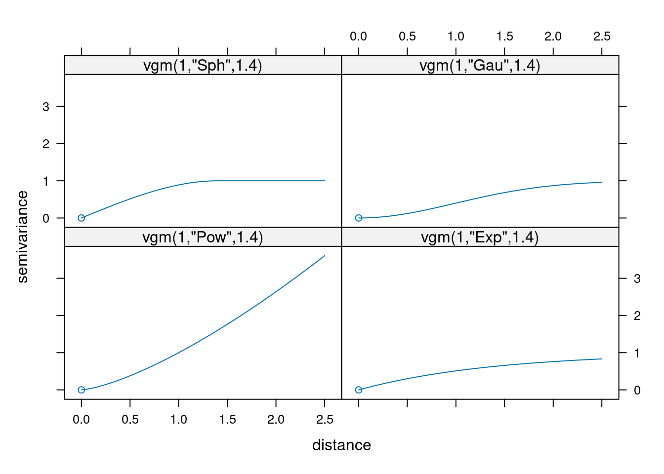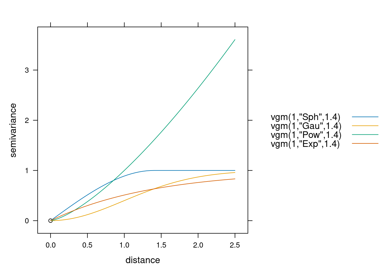 show.vgms(models = c("Sph", "Gau", "Pow", "Exp"),
