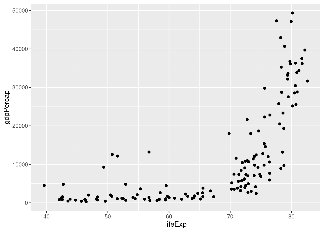 ggplot(gapminder2007_s, aes(lifeExp, gdpPercap)) + geom_point()