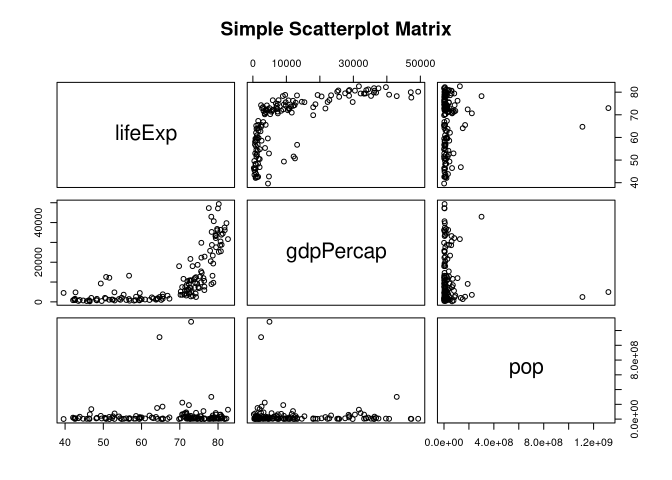 pairs(~lifeExp+gdpPercap+pop, data=gapminder2007_s, main="Simple Scatterplot Matrix")