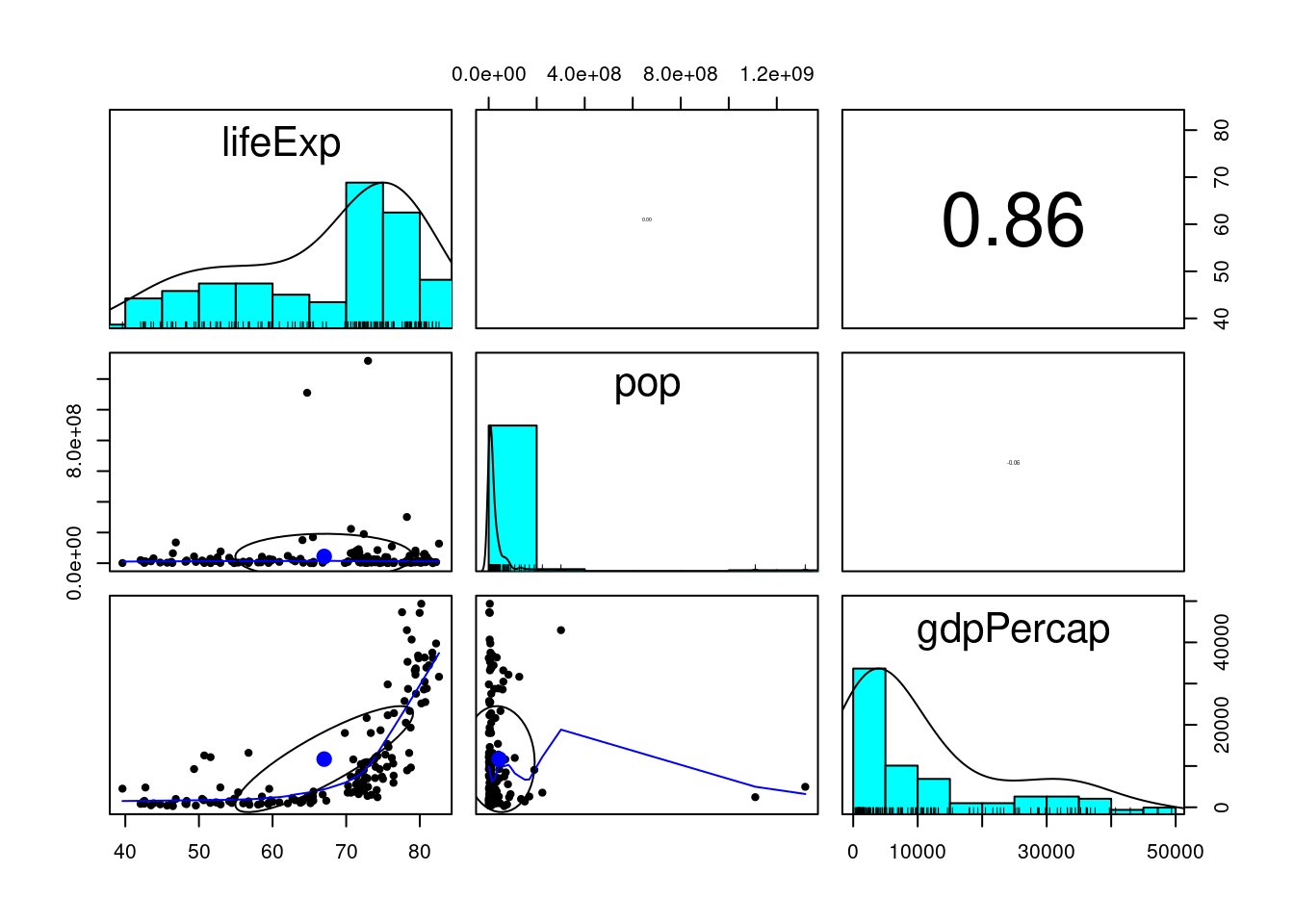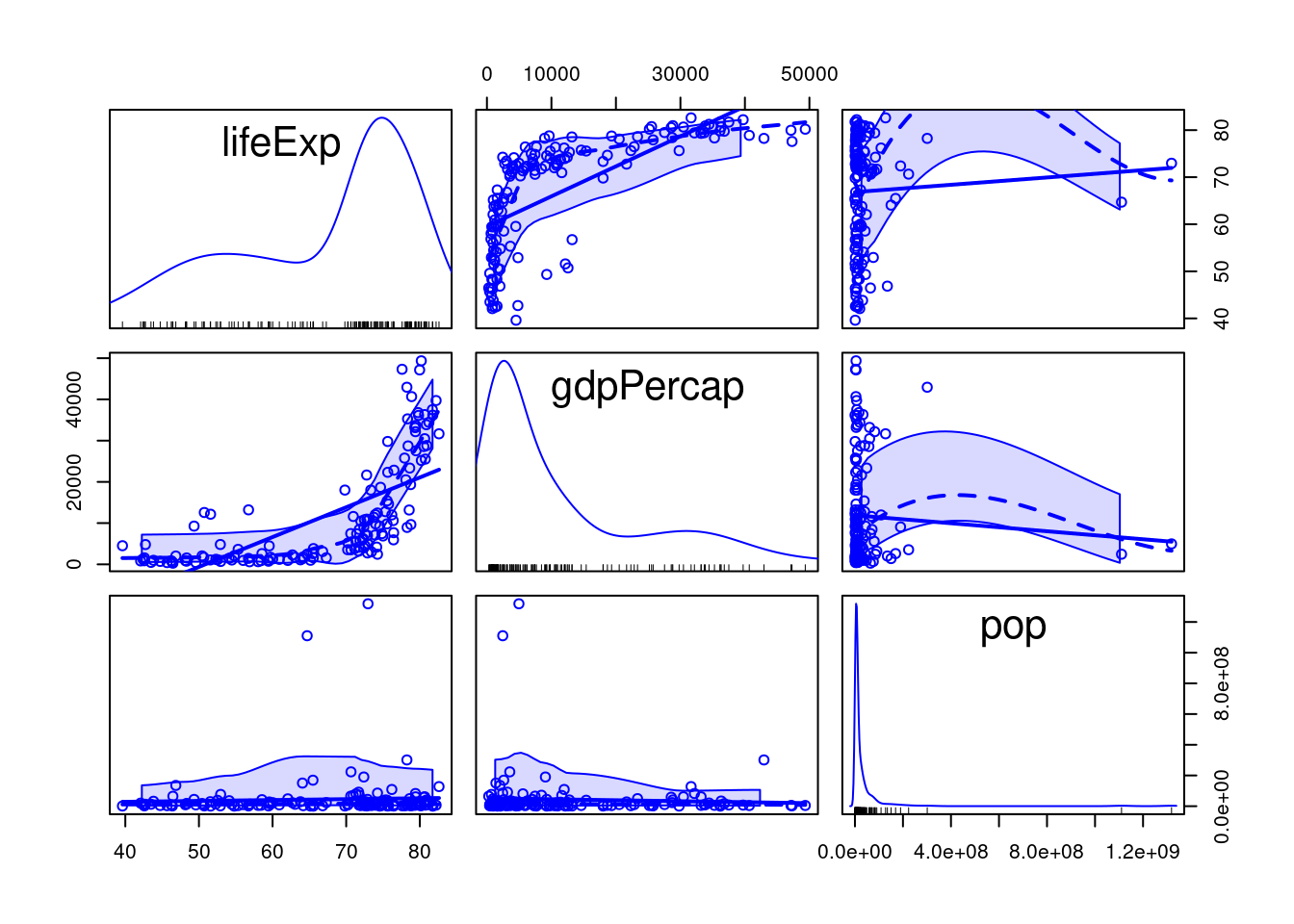 scatterplotMatrix(~lifeExp+gdpPercap+pop, data=gapminder2007_s)