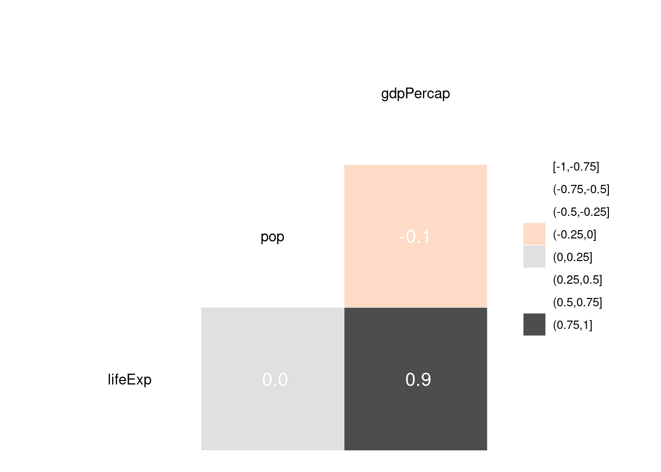 ggcorr(gapminder2007_s, method = c("pairwise", "spearman"), nbreaks=8, palette='RdGy', label=TRUE, label_size=5, label_color='white')