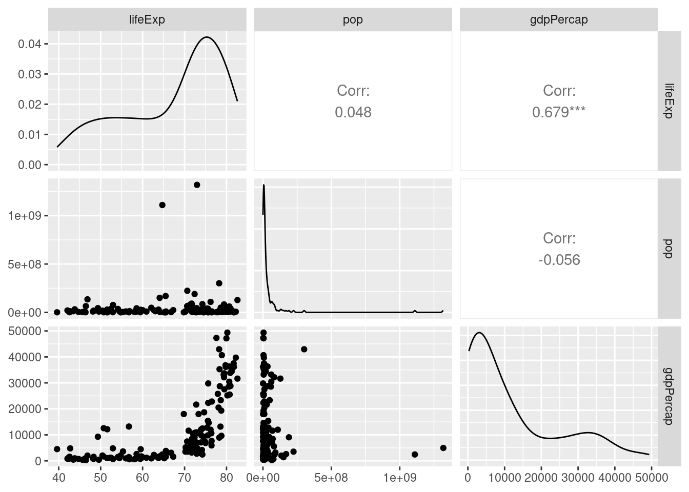 gapminder2007_s = gapminder2007[c(4, 5, 6)]Czy pomiędzy zmiennymi w zbiorze gapminder2007_s można dostrzec zależności liniowe?