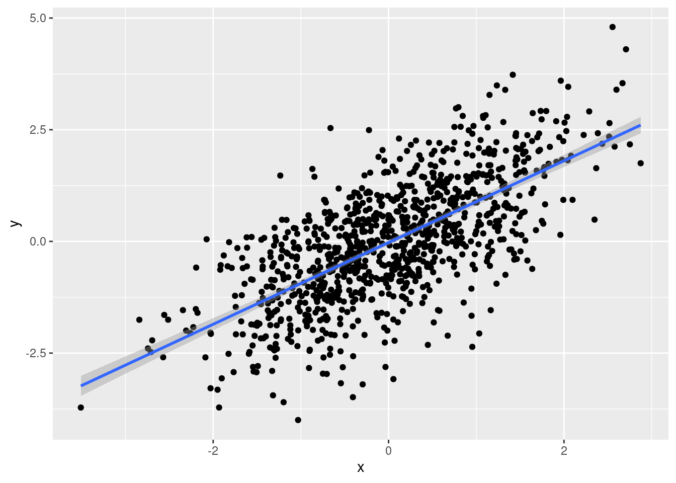 ggplot(df, aes(x, y)) + geom_point() + stat_smooth(method = lm)