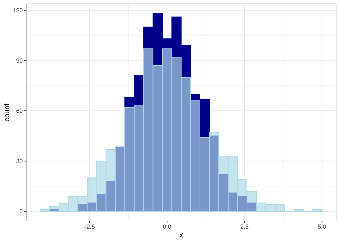 geom_histogram(aes(x = x), col = "darkblue", fill = "darkblue") +