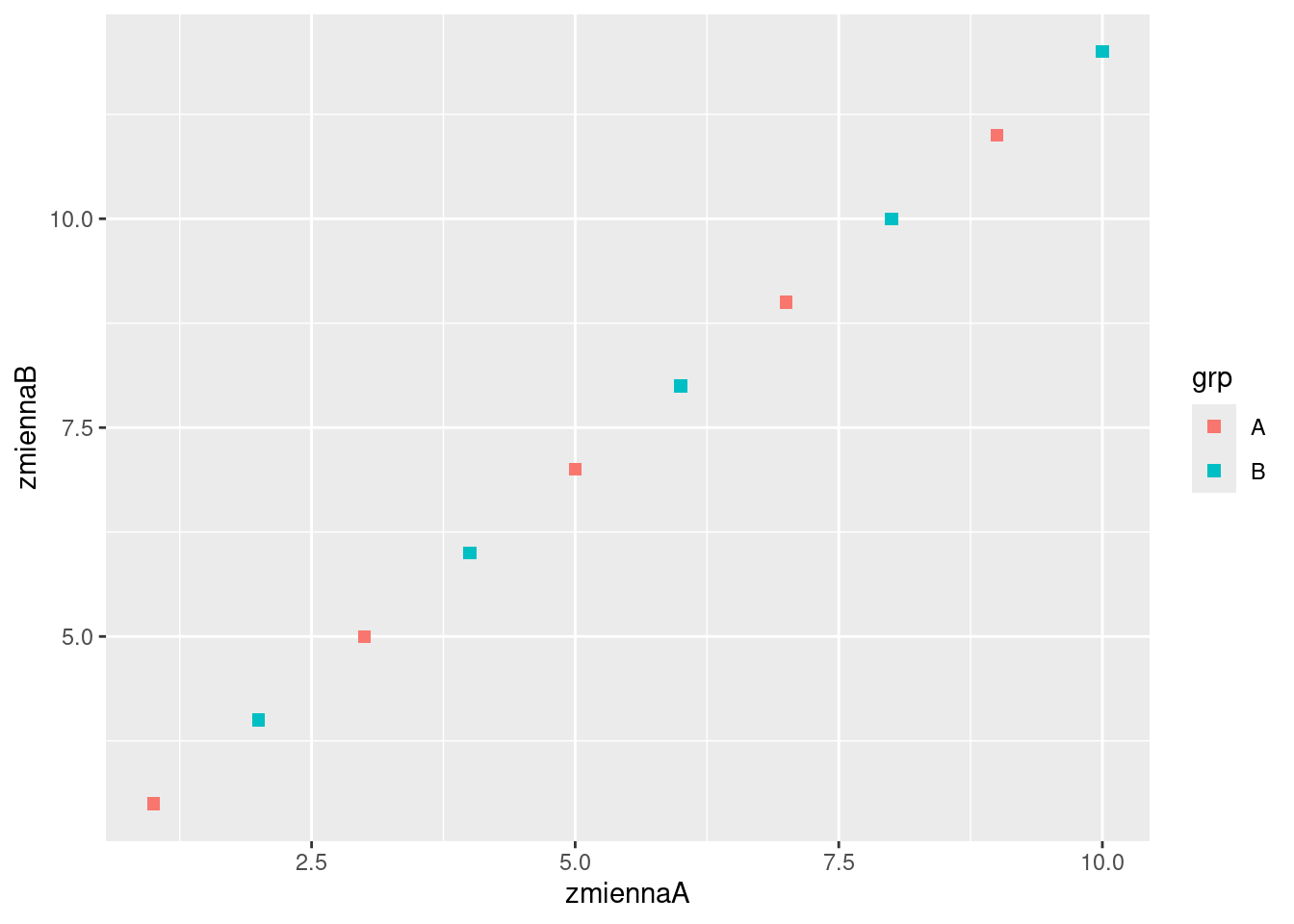 ggplot(df, aes(x = zmiennaA, y = zmiennaB, color = grp)) +