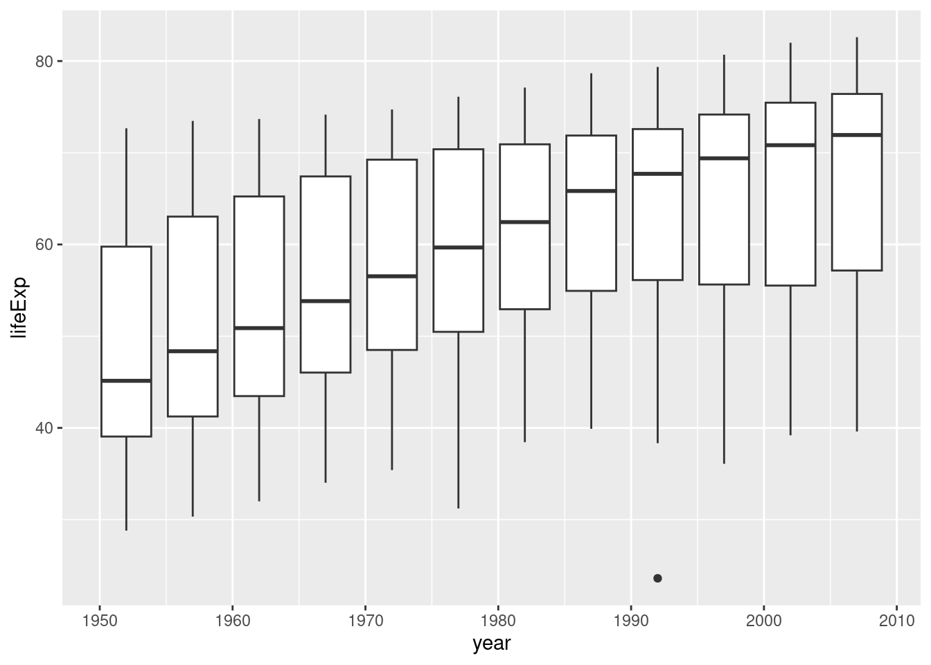 ggplot(data = gapminder, aes(x = year, y = lifeExp, group = year)) + geom_boxplot()