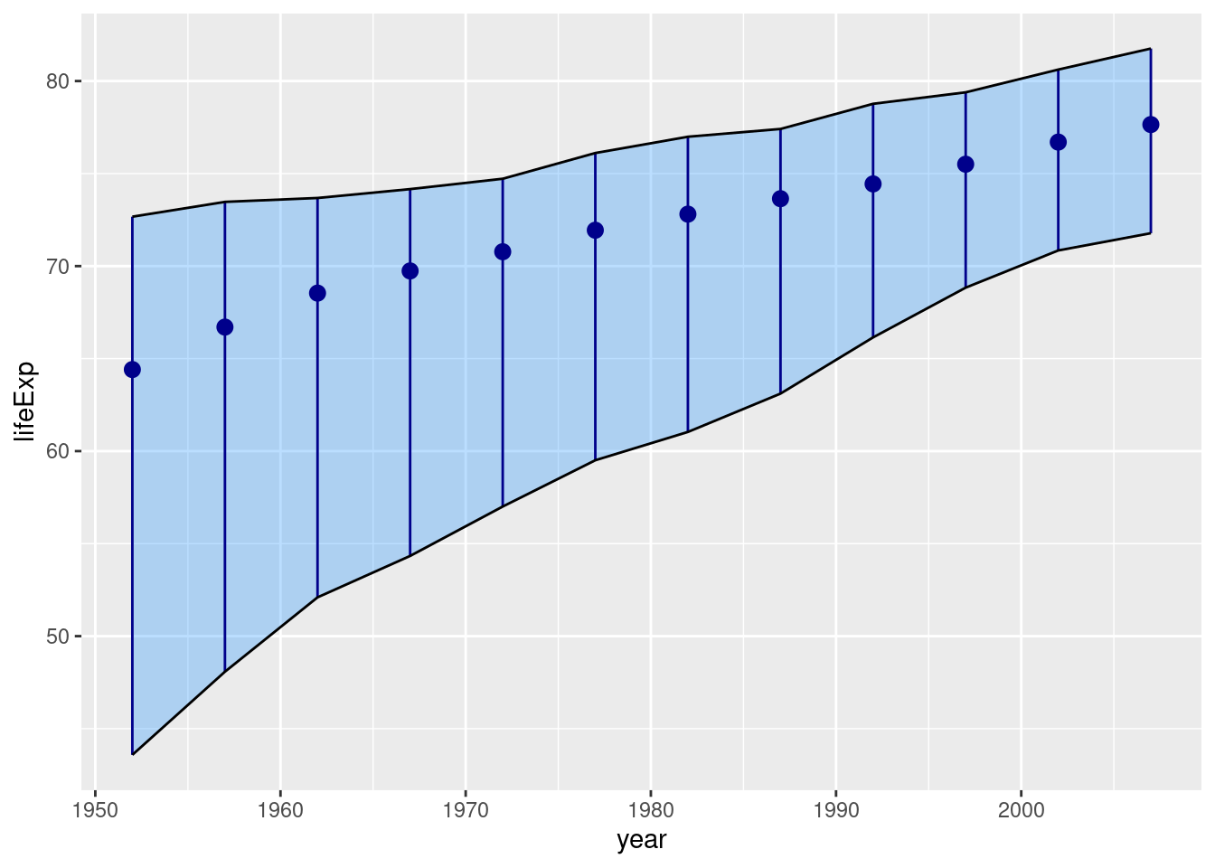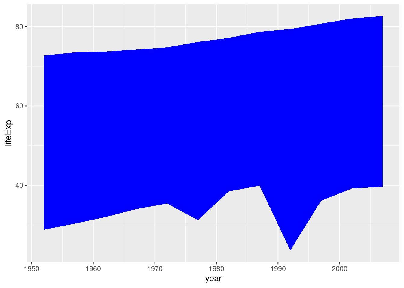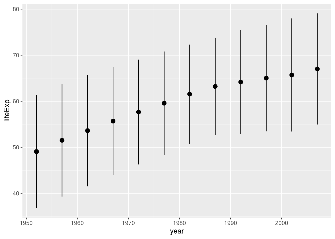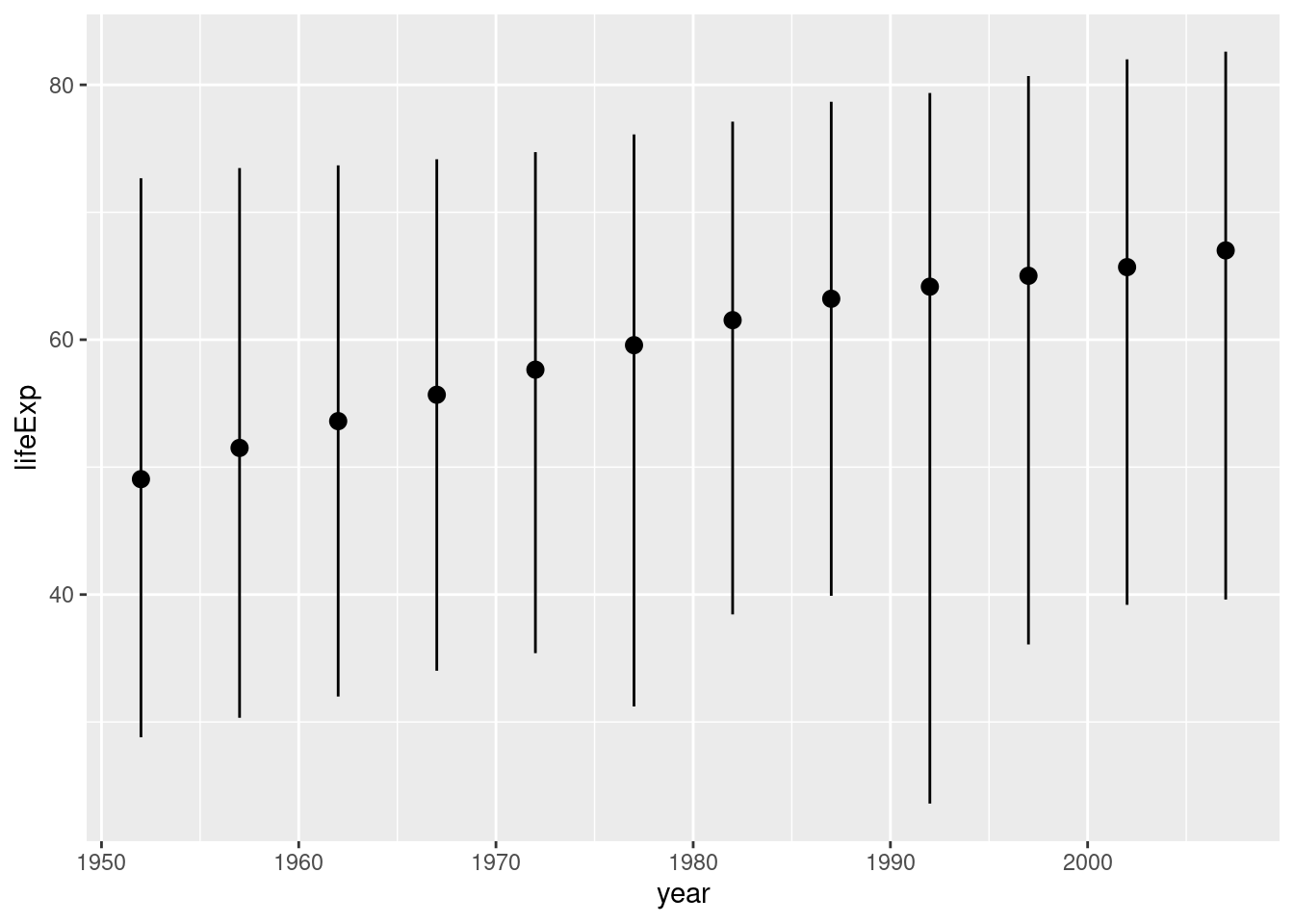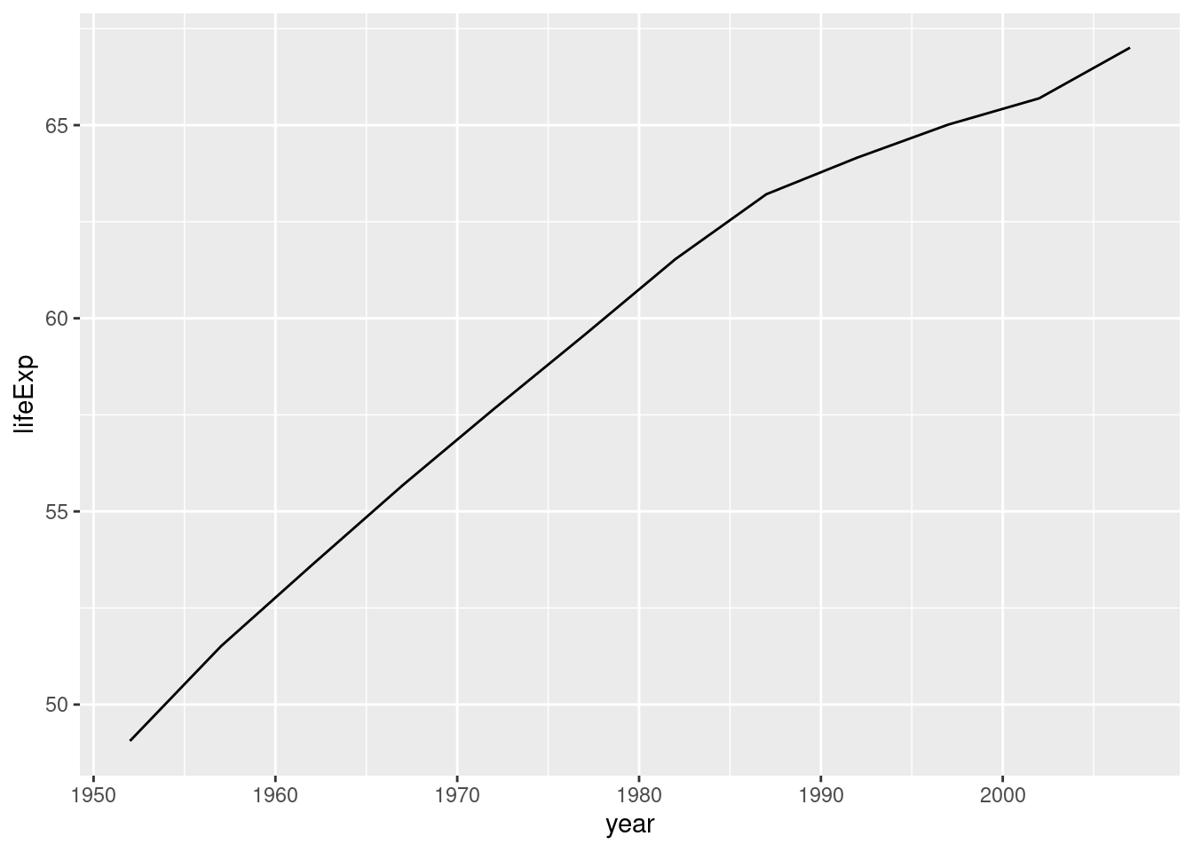 ggplot(gapminder, aes(x = year, y = lifeExp)) +