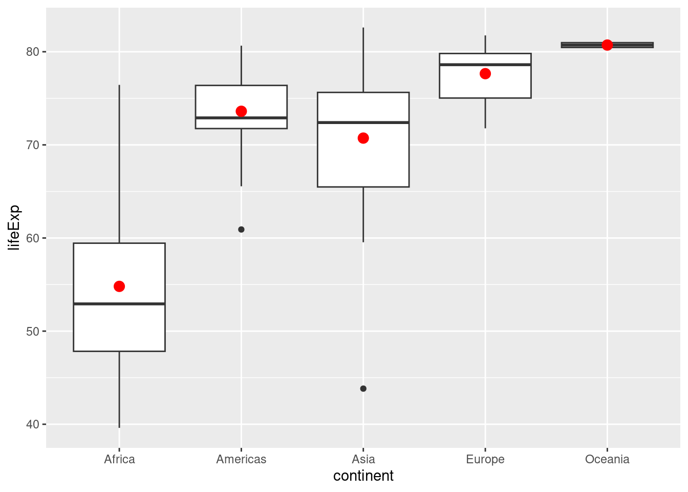 ggplot(data = gapminder, aes(x = continent, y = gdpPercap)) + geom_boxplot() 7.6 stat_summary