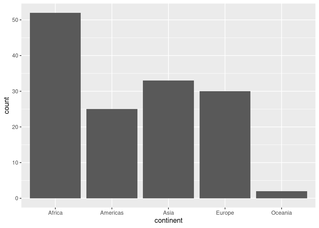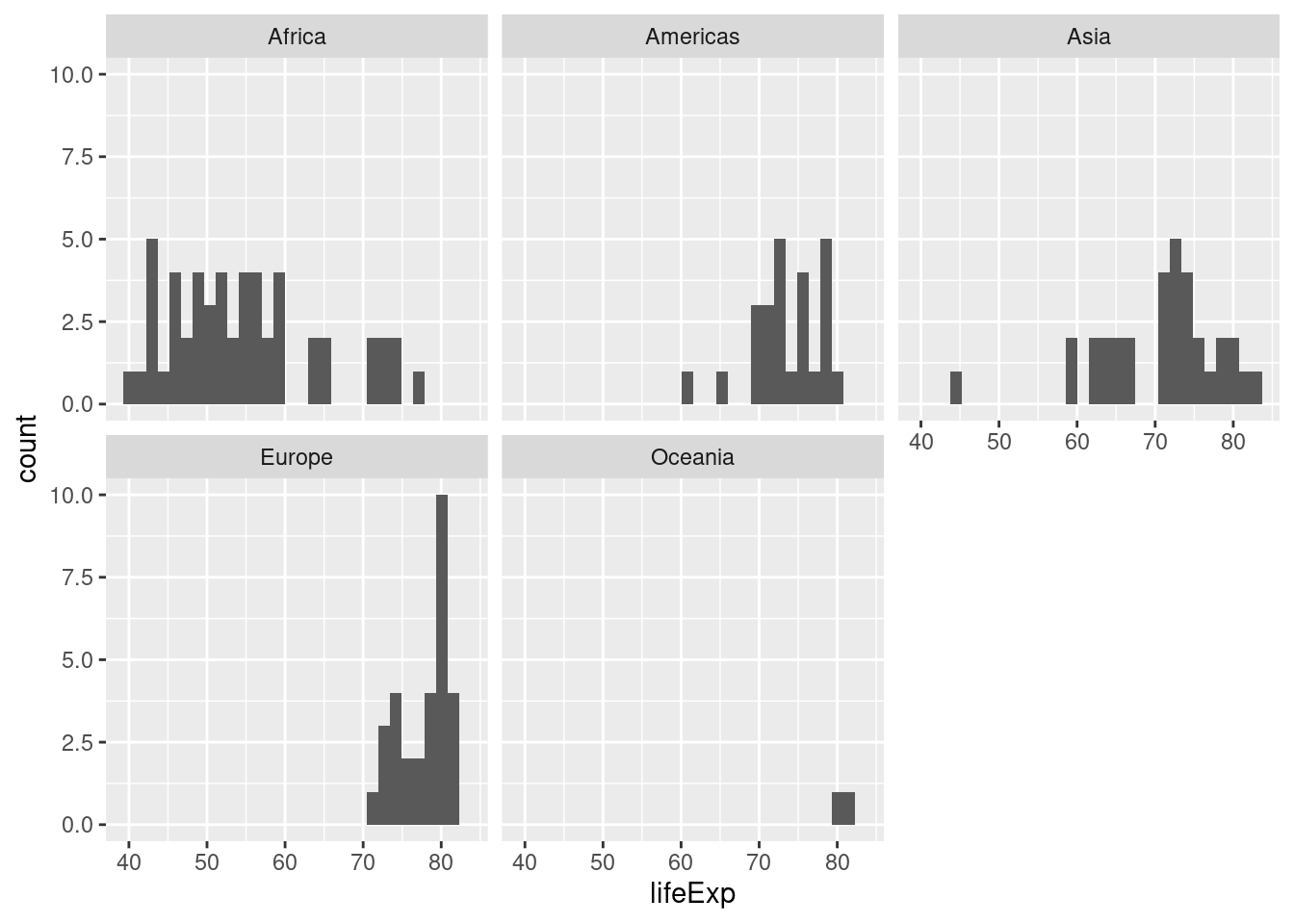 facet_wrap(~continent)`stat_bin()` using `bins = 30`. Pick better value with `binwidth`.