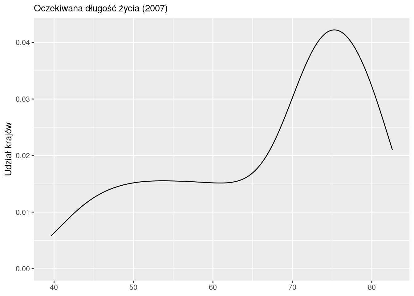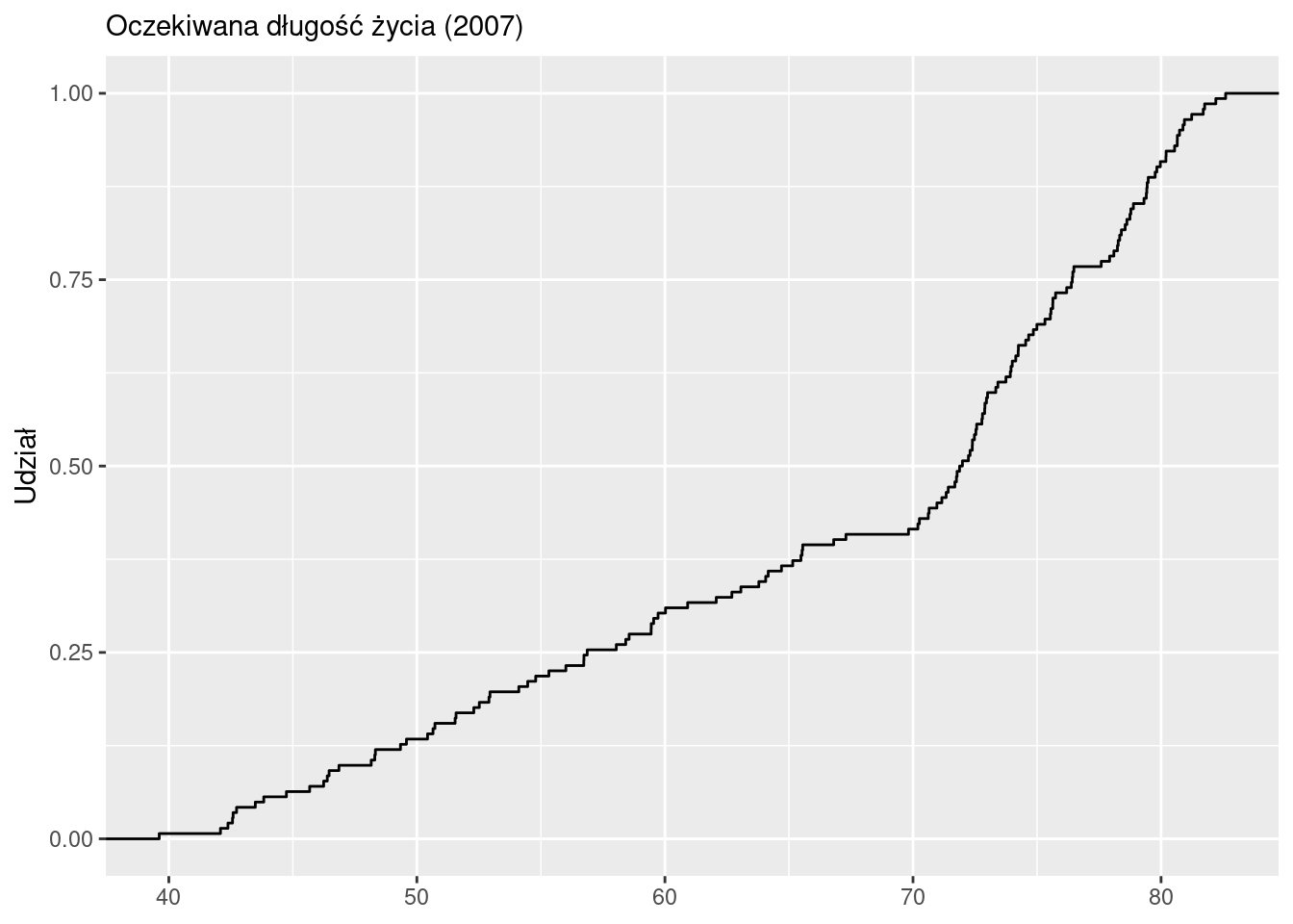 labs(x = NULL, y = "Udział krajów", subtitle = "Oczekiwana długość życia (2007)")