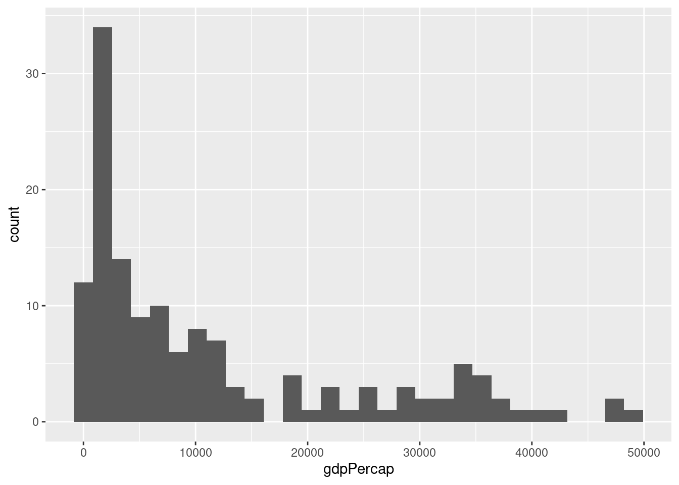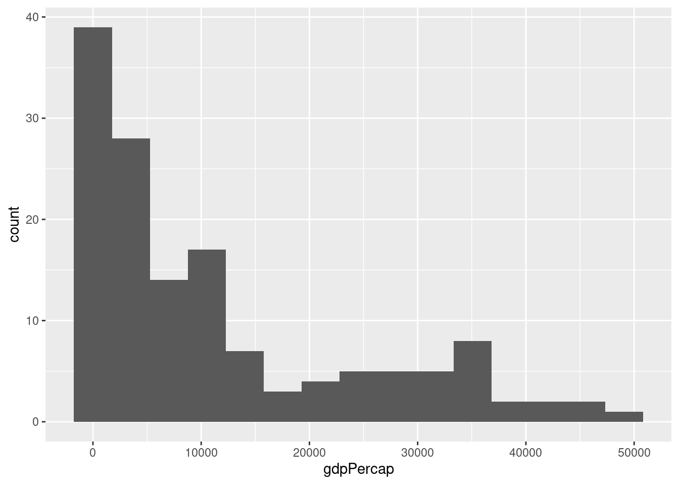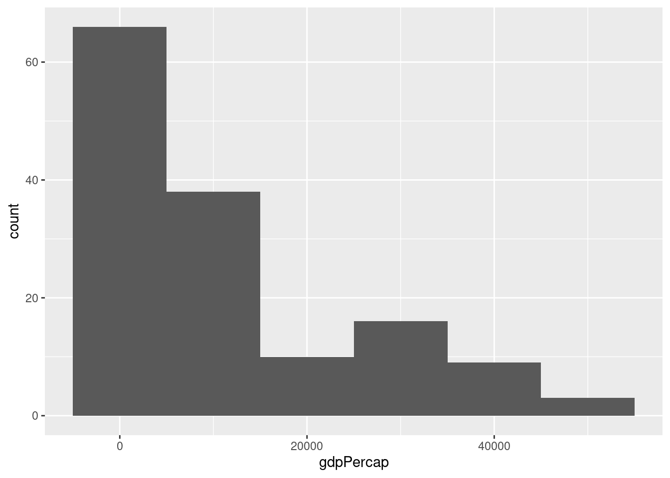 ggplot(dane2007, aes(x = gdpPercap)) + geom_histogram()`stat_bin()` using `bins = 30`. Pick better value with `binwidth`.