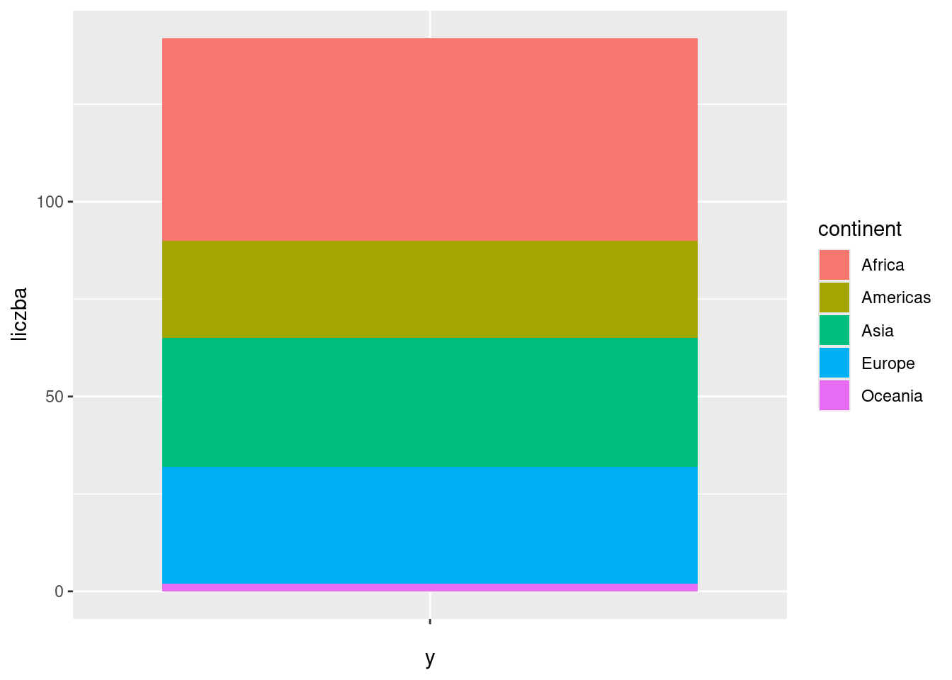 summarize(liczba = n())ggplot(data = gapminder2007_unique, aes(y = "", x = liczba, fill = continent)) +