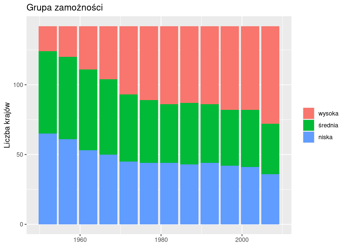 labs(x = NULL, y = "Liczba krajów", fill = NULL, title = "Grupa zamożności")