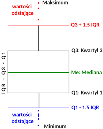 - linie pionowe oznaczają najbardziej ekstremalne wartości (1,5IQR ponad krawędź pudełka, dolna to 1,5IQR poniżej wartości dolnej krawędzi pudełka)