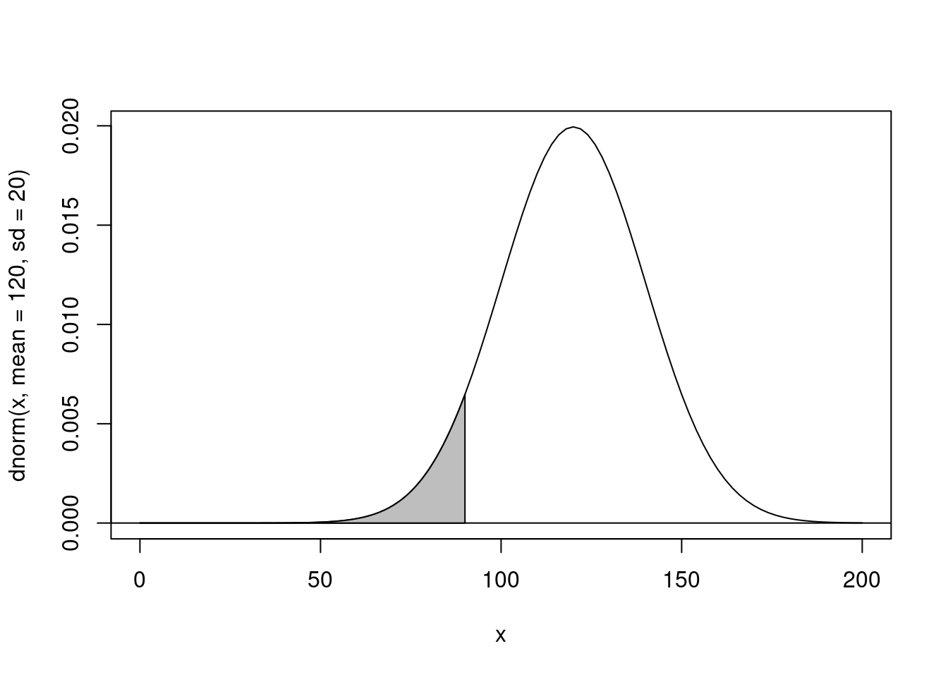 pnorm(q = 90, mean = 120, sd = 20, lower.tail = TRUE)[1] 0.0668072