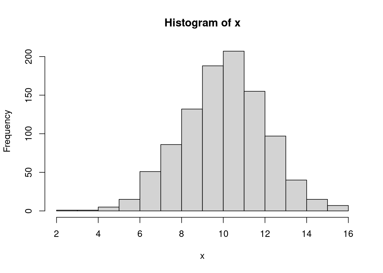 x <- rnorm(1000, mean = 10, sd = 2)hist(x)