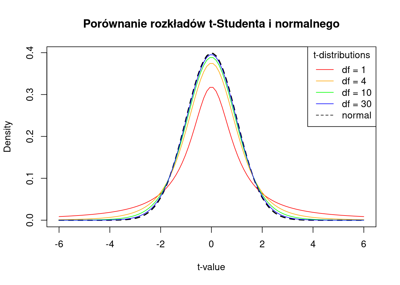 - Rozkład ten zależy tylko od jednego parametru - liczby stopni swobody (parametrt \(df\)). Im więcej stopni swobody, tym rozkład bardziej zbliżony do rozkładu normalnego.