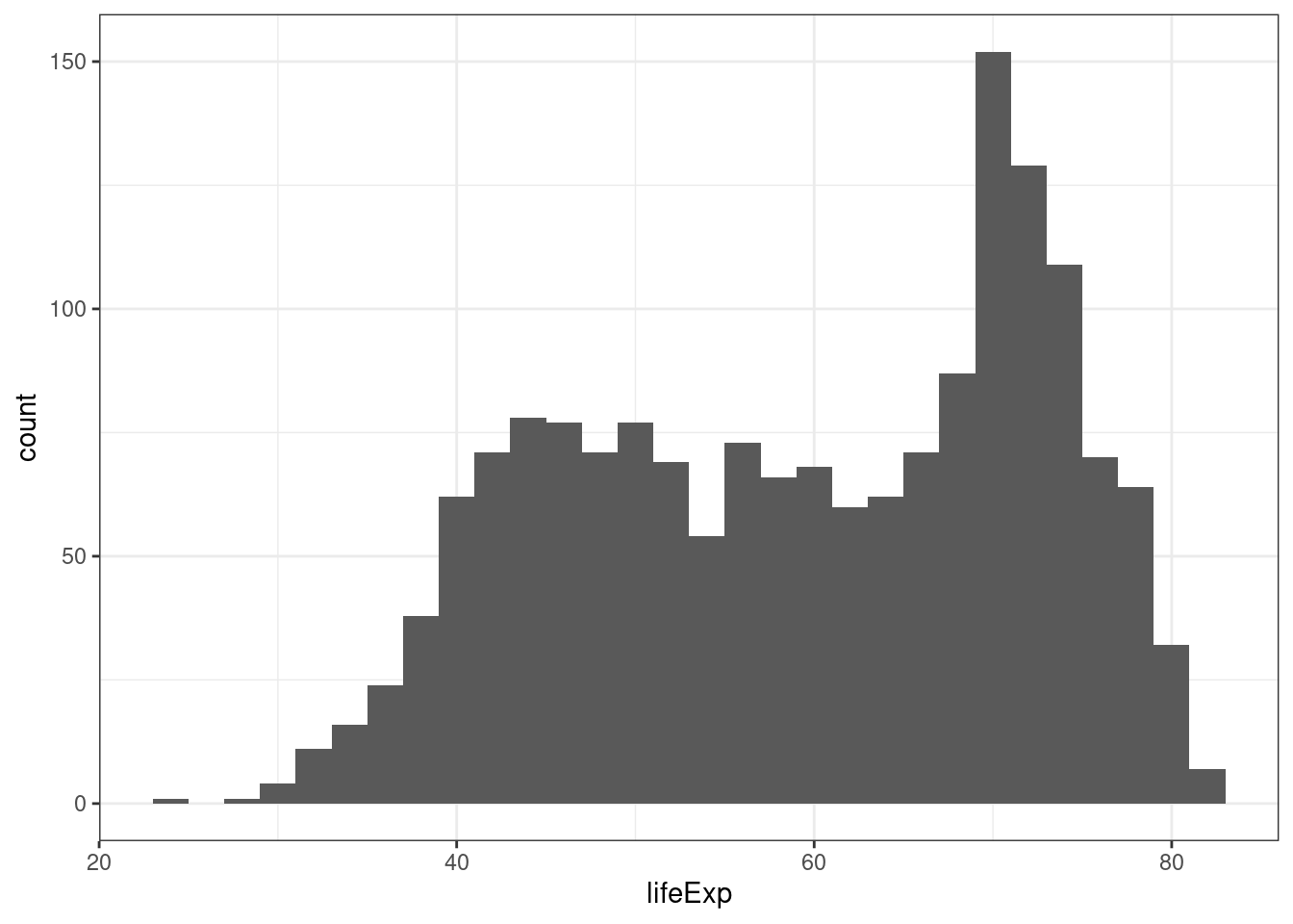 ggplot(data = gapminder, aes(x = lifeExp)) + geom_histogram(binwidth = 2) + theme_bw()