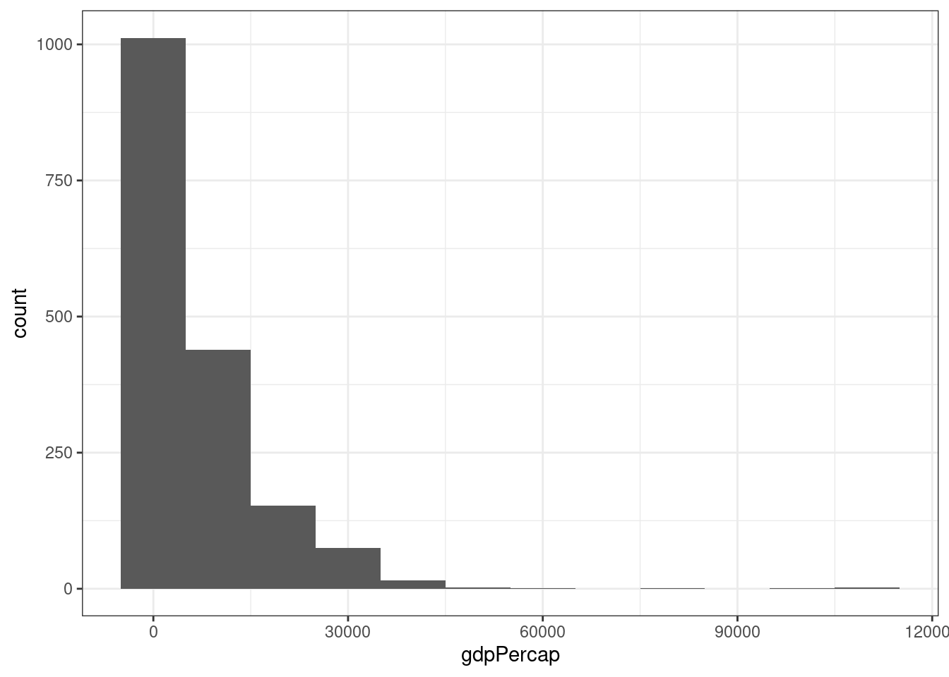 ggplot(data = gapminder, aes(x = gdpPercap)) + geom_histogram(binwidth=10000) + theme_bw()