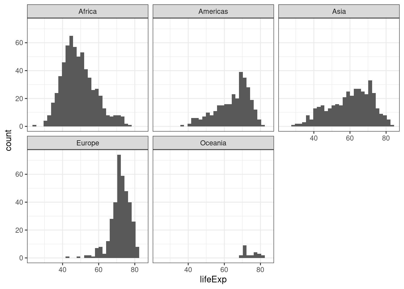 ggplot(data = gapminder, aes(x = pop)) + geom_histogram() + theme_bw()- Rozkład oczekiwanej długości trwania życia (lifeExp) według kontynentów