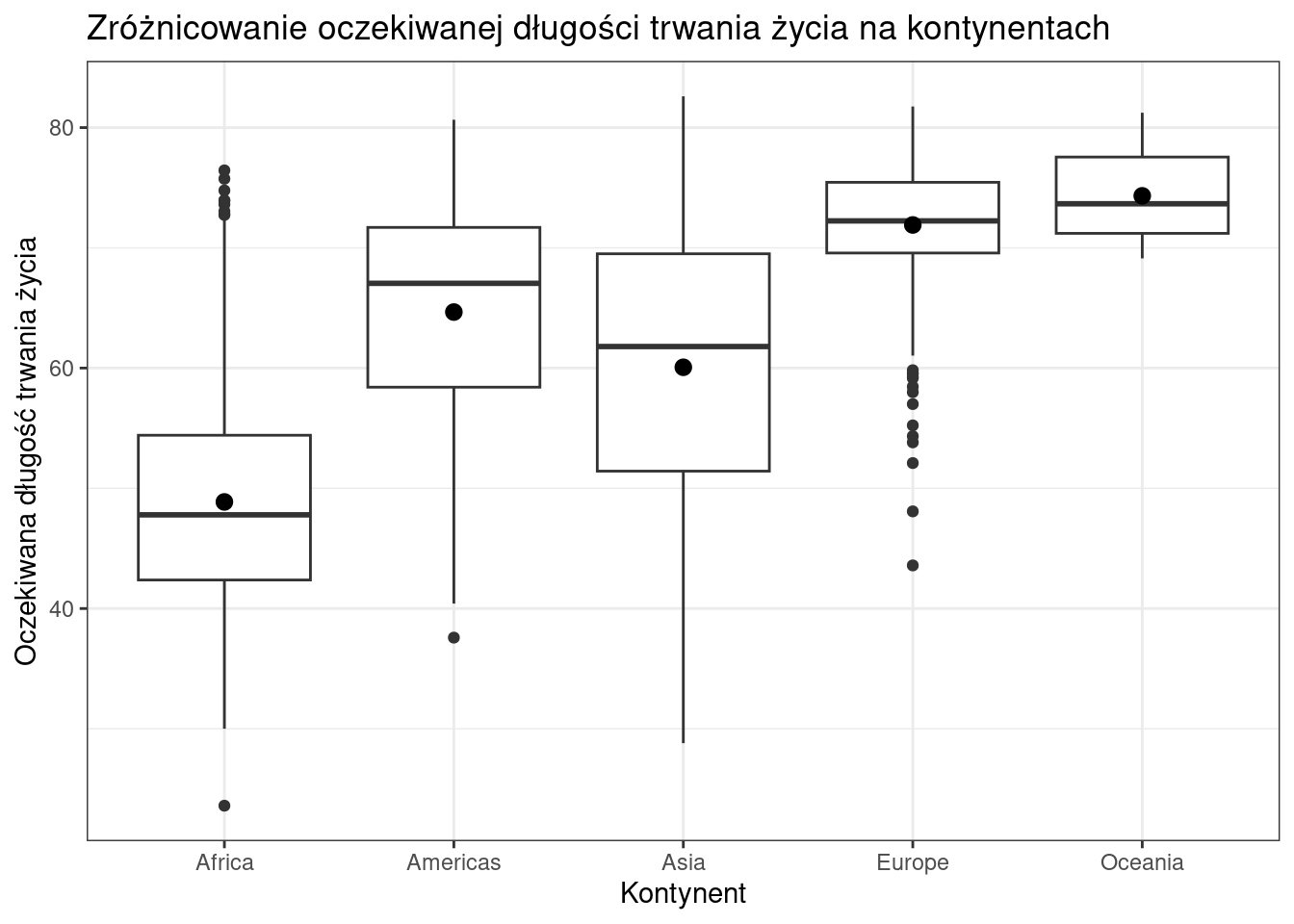 title = "Zróżnicowanie oczekiwanej długości trwania życia na kontynentach") +