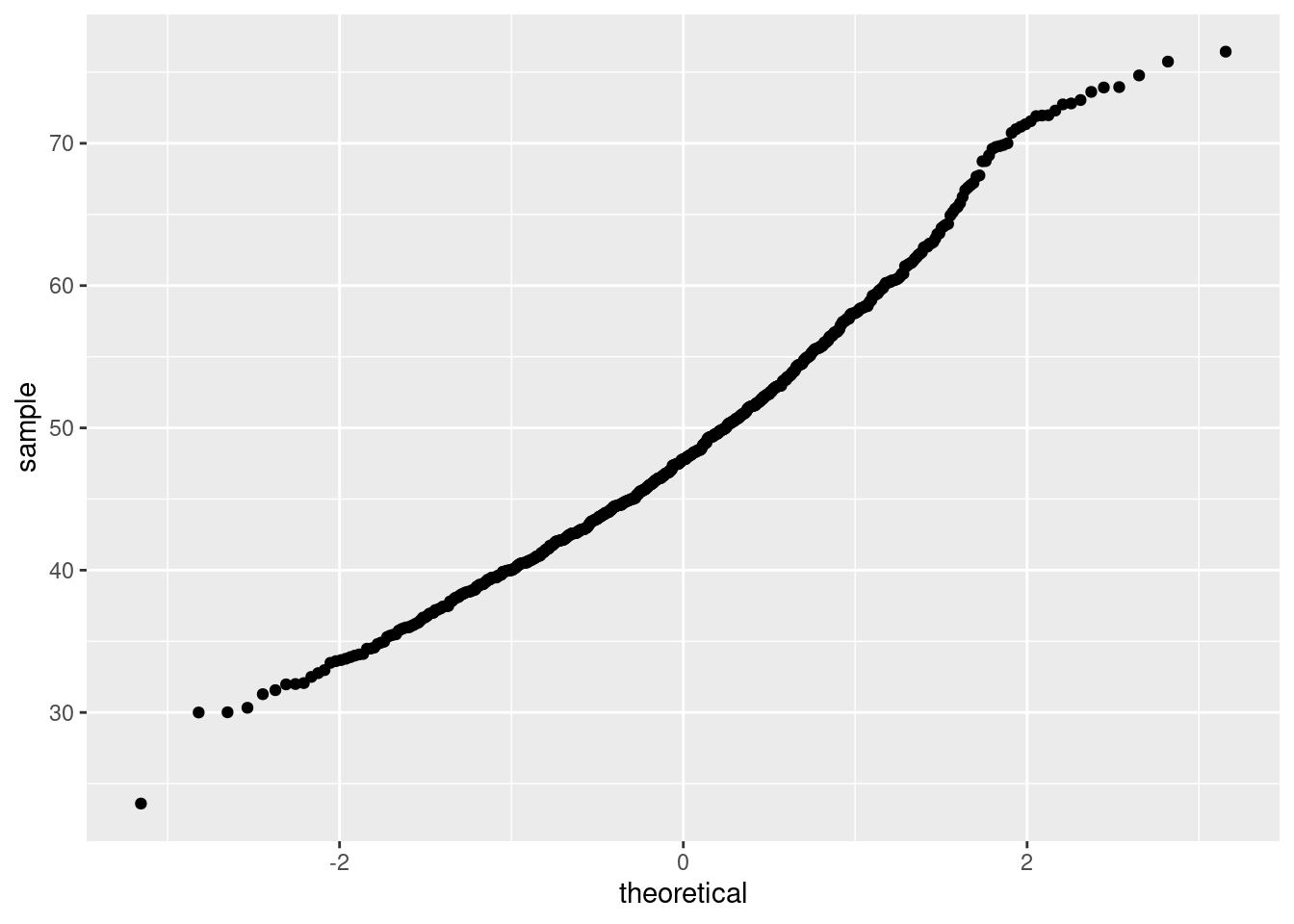 dane_Africa <- gapminder[gapminder$continent == 'Africa',]ggplot(data = dane_Africa, aes(sample = lifeExp)) + stat_qq()