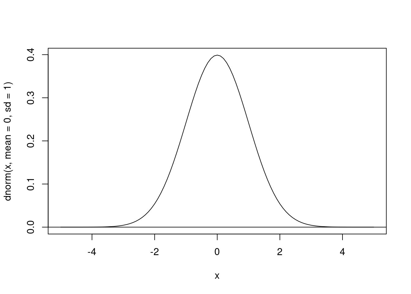 curve(dnorm(x, mean = 0, sd = 1), xlim = c(-5, 5))