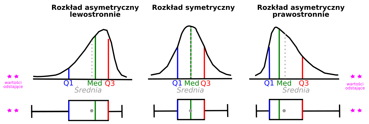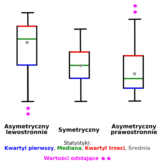 Wykres pudełkowy poza wizaulizacją statystyk opisowych pozwala także na określenie typu rozkładu danych (symetryczny, asymetryczny).